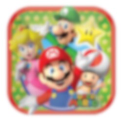 8 quadratische Kuchenteller mit Motiven von Mario, Luigi, Prinzessin Peach und Toad aus Super Mario Bros. Bieten Sie auf diesen Kuchentellern leckeren Kuchen für die Party an. Die Kuchenteller bestehen aus Papier und sind 18 x 18 cm Groß.