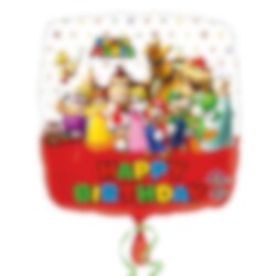 Dekorativer Folienballon mit dem Text "Happy Birthday“ und mit Motiven von Mario und der Bande aus den klassischen Videospielen Super Mario Bros. Dekorieren Sie damit den Partyraum. Der Ballon hat im aufgeblasenen Zustand einen Durchmesser von etwa 43 cm. Kann mit Luft oder Helium gefüllt werden.