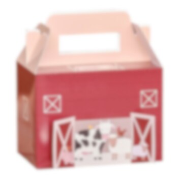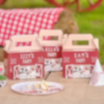 5 schöne Geschenkboxen, die Scheunen mit Bauernhoftieren darstellen. Die Geschenkboxen haben aufklappbare Türen und das Paket enthält außerdem 15 Bögen mit weißen Buchstaben, die Sie verwenden können, um die Geschenkboxen für jedes Kind auf der Party zu personalisieren.