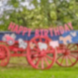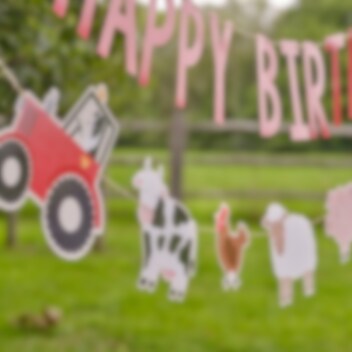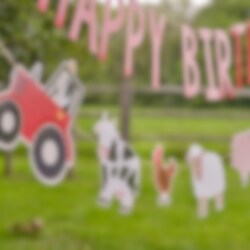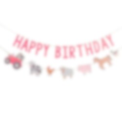 Hübsche Girlande mit dem Text "Happy Birthday" und mit Motiven von verschiedenen Bauernhoftieren. Die Girlande besteht aus Pappe und ist 4 Meter lang.