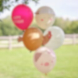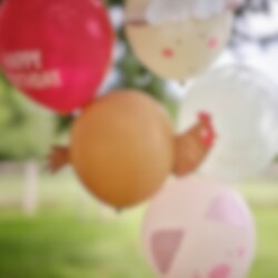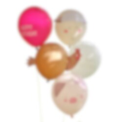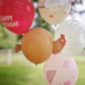 5 Luftballons in schönen Farben, die sich mit dem mitgelieferten Zubehör in niedliche Bauernhoftiere verwandeln. Die Luftballons haben einen Durchmesser von 30 cm.
