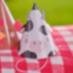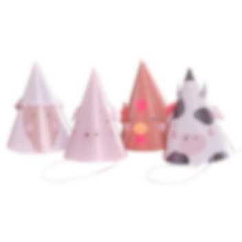 8 stilvolle Partyhüte mit lustigen Motiven von Schafen, Schweinen, Hühnern und Kühen, die eine tolle Ergänzung für eine Party zum Thema Bauernhof darstellen. Die Partyhüte sind 19 cm hoch und werden von einem Gummiband gehalten.
