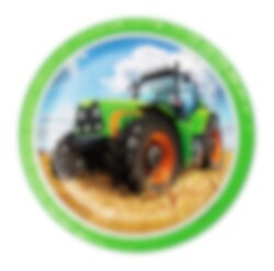 8 Kuchenteller mit lustigem Motiv eines Traktors. Die Kuchenteller haben einen Durchmesser von etwa 18 cm.
