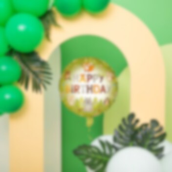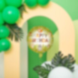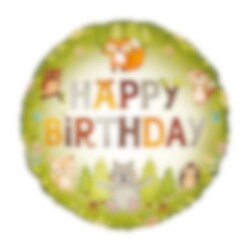 Schöner Folienballon im Waldthema, dekoriert mit niedlichen kleinen Waldtieren und dem Text 'Happy Birthday'.