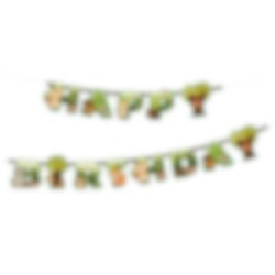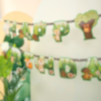 Schöne Girlande aus Pappe mit dem Text 'Happy Birthday' und niedlichen Waldtiermotiven, perfekt als Dekoration für eine waldtierinspirierte Kinderparty.