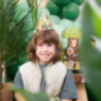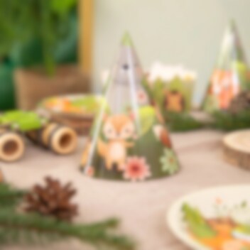 6 Partyhüte in schönen Farben mit niedlichen Waldtiermotiven, perfekt für eine Party mit Waldthema.