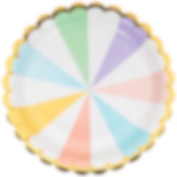 8 Pappteller in schönen Pastellfarben mit vergoldeten Rändern zum schönen Thema "Ice Cream Party“. Sehr schöne Tischdeko für jede Art von Party. Die Teller haben einen Durchmesser von etwa 23 cm.