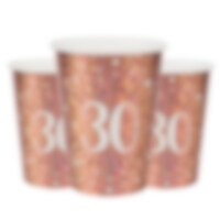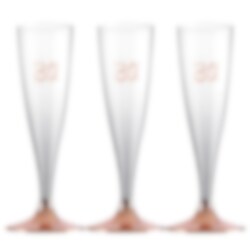 6 Stück schönen und praktischen Einweggläser im Champagner-Stil. Mit den Gläsern können Sie auf der 30. Geburtstagsfeier sowohl den Tisch decken als auch sich unter die Gäste mischen. Die Gläser fassen 14 cl. und stehen auf einem Fuß aus Roségold und haben die Zahl "30" oben aufgedruckt.