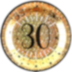 10 glänzende Pappteller in Gold mit der Zahl 30 in Schwarz. Diese eleganten Teller sind perfekt geeignet, um Kuchen, Snacks oder Desserts auf einer 30. Geburtstagsfeier stilvoll zu servieren. Sie bestehen aus stabiler Pappe und haben einen Durchmesser von ca. 22,5 cm.