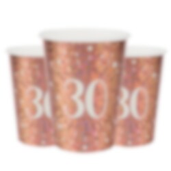 10 glitzernder Pappbecher in Roségold mit der Zahl "30". Diese Becher sind wirklich schön und dekorativ, wenn Sie für eine 30. Geburtstagsfeir decken. Die Becher sind etwa 10 cm hoch und fassen 270 ml.