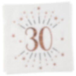10 weiße Servietten mit roségold glitzernden Mustern und der Zahl "30". Diese Servietten sind sehr dekorativ, wenn Sie für eine 30. Geburtstagsfeier eindecken. Die Servietten haben 3 Lagen und fühlen sich luxuriös an. Größe 16,5 x 16,5 cm.