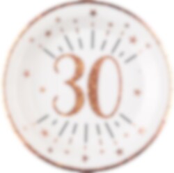 10 schöne Teller, die in Roségold glitzern, mit der Zahl "30" in der Mitte. Diese Teller sind beeindruckend und eignen sich perfekt für die 30. Geburtstagsfeier. Die Teller sind aus Pappe und haben einen Durchmesser von 22,5 cm.