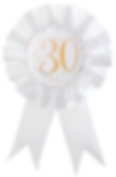 Schöne Rosette in Weiß und Gold mit der Zahl 30. Die Rosetten können sowohl als dekoratives Zubehör in beispielsweise Blumenarrangements verwendet werden, als auch von Ihnen an Ihrem 30. Geburtstag getragen werden. Die Rosette hat einen Durchmesser von 8 cm und ist 15 cm hoch.