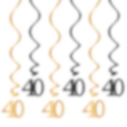 Verleihen Sie der 40. Geburtstagsparty extra Glanz mit diesen hängenden Dekorationen in Schwarz und Gold! Das Set enthält sechs spiralförmige Dekorationen aus glänzender Folie, drei mit der Zahl 40 in Gold und drei in Schwarz.
