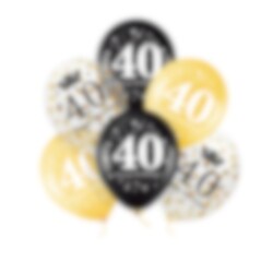 Feiern Sie den 40. Geburtstag mit Stil! Dieses Set enthält zwei schwarze, zwei goldfarbene und zwei transparente Luftballons mit Konfetti – alle mit einem eleganten "40“-Aufdruck, der jede Dekoration perfekt abrundet.