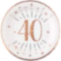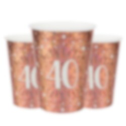 10 glitzernder Pappbecher in Roségold mit der Zahl "40". Diese Becher sind wirklich schön und dekorativ, wenn Sie für eine 40. Geburtstagsfeir decken. Die Becher sind etwa 10 cm hoch und fassen 270 ml.