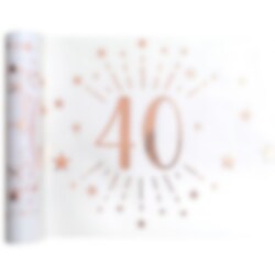 Schöner Tischläufer, der mit dekorativen Mustern in Roségold und den Zahlen "40" glitzert. Dieser Tischläufer kommt in einer praktischen Rolle und ist 30 cm breit und ganze 5 Meter lang. Es reicht für mehrere Tische und eine große 40. Geburtstagsfeier. Das Material ist 100% Polyester.