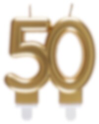 Tortenkerze in Gold elegant in Form von der Zahl 50. Die Tortenkerze hat eine Größe von 7,5 x 9 cm.