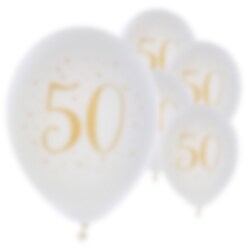 8 weiße Luftballons mit der Zahl 50 und Sternen in Gold. Die Ballons sind dekorativ und können mit vielen anderen Dekorationen und Tischzubehör abgestimmt werden, wenn Sie Ihren 50. Geburtstag feiern.