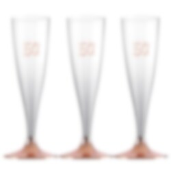 6 Stück schönen und praktischen Einweggläser im Champagner-Stil. Mit den Gläsern können Sie auf der 50. Geburtstagsfeier sowohl den Tisch decken als auch sich unter die Gäste mischen. Die Gläser fassen 14 cl. und stehen auf einem Fuß aus Roségold und haben die Zahl "50" oben aufgedruckt.