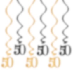 Verleihen Sie der 50. Geburtstagsparty extra Glanz mit diesen hängenden Dekorationen in Schwarz und Gold! Das Set enthält sechs spiralförmige Dekorationen aus glänzender Folie, drei mit der Zahl 50 in Gold und drei in Schwarz.