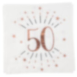 10 weiße Servietten mit roségold glitzernden Mustern und der Zahl "50". Diese Servietten sind sehr dekorativ, wenn Sie für eine 50. Geburtstagsfeier eindecken. Die Servietten haben 3 Lagen und fühlen sich luxuriös an. Größe 16,5 x 16,5 cm.