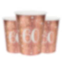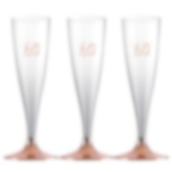 6 Stück schönen und praktischen Einweggläser im Champagner-Stil. Mit den Gläsern können Sie auf der 60. Geburtstagsfeier sowohl den Tisch decken als auch sich unter die Gäste mischen. Die Gläser fassen 14 cl. und stehen auf einem Fuß aus Roségold und haben die Zahl "60" oben aufgedruckt.