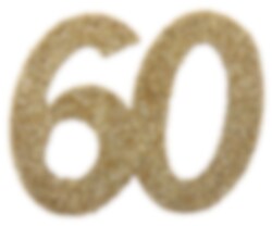 6 glitzerndes großes goldenes Konfetti zum Dekorieren auf der 60. Geburtstagsfeier. Das Konfetti ist in Form von der Zahl 60 und ist 6 x 6 cm groß. Sie sind aus Pappe hergestellt.