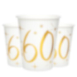 10 weiße Pappbecher mit dekorativen Sternen und der Zahl 60 in Goldfolie. Diese Becher sind wirklich schön und eine perfekte Ergänzung für die Party zum 60. Geburtstag. Die Becher sind 10 cm hoch und fassen 270 ml.