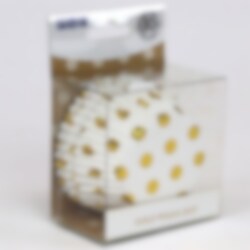 30 weiße Muffinförmchen mit Punkten aus Goldfolie. Nutzen Sie diese, um süßes Gebäck für die Party zu backen. Der Bodendurchmesser der Muffinförmchen beträgt ungefähr 5 cm.