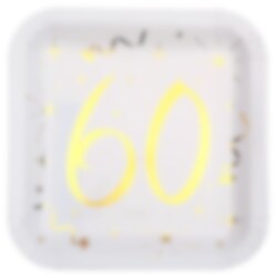 10 weiße Pappteller mit dekorativen Mustern und der Zahl 60 in Goldfolie. Diese quadratischen Teller sind eine schöne Ergänzung für die Partydekoration zum 60. Geburtstag. Die Teller sind 23 x 23 cm groß.