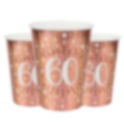 10 glitzernder Pappbecher in Roségold mit der Zahl "60". Diese Becher sind wirklich schön und dekorativ, wenn Sie für eine 60. Geburtstagsfeir decken. Die Becher sind etwa 10 cm hoch und fassen 270 ml.