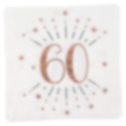10 weiße Servietten mit roségold glitzernden Mustern und der Zahl "60". Diese Servietten sind sehr dekorativ, wenn Sie für eine 60. Geburtstagsfeier eindecken. Die Servietten haben 3 Lagen und fühlen sich luxuriös an. Größe 16,5 x 16,5 cm.