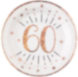 10 schöne Teller, die in Roségold glitzern, mit der Zahl "60" in der Mitte. Diese Teller sind beeindruckend und eignen sich perfekt für die 60. Geburtstagsfeier. Die Teller sind aus Pappe und haben einen Durchmesser von 22,5 cm.