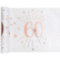 Schöner Tischläufer, der mit dekorativen Mustern in Roségold und den Zahlen "60" glitzert. Dieser Tischläufer kommt in einer praktischen Rolle und ist 30 cm breit und ganze 5 Meter lang. Es reicht für mehrere Tische und eine große 60. Geburtstagsfeier. Das Material ist 100% Polyester.