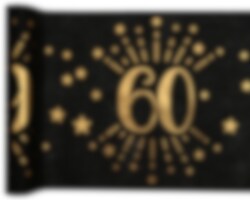 Schwarzer Tischläufer mit dekorativen Mustern und der Zahl 60 in goldener Folie. Der Tischläufer wird als praktische Rolle geliefert, ist 30 cm breit und ganze 5 Meter lang – ideal, um mehrere Tische festlich zu dekorieren. Das Material besteht aus 100 % Polyester.