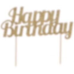 Tortendekoration mit dem Text "Happy Birthday" in glitzernder Goldfarbe. Dekorieren Sie die Torte damit, wenn eine Geburtstagsfeiern ansteht, um die Torte besonders schick zu machen. Die Dekoration ist etwa 10 x 14 cm groß.