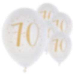 8 weiße Luftballons mit der Zahl 70 und Sternen in Gold. Die Ballons sind dekorativ und können mit vielen anderen Dekorationen und Tischzubehör abgestimmt werden, wenn Sie Ihren 70. Geburtstag feiern.