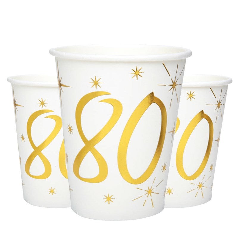 Pappbecher Weiß & Gold 80. Geburtstag, 10er-Pack