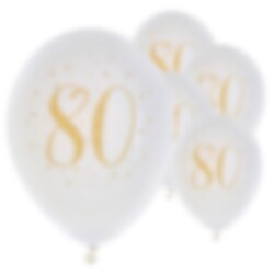 8 weiße Luftballons mit der Zahl 80 und Sternen in Gold. Die Ballons sind dekorativ und können mit vielen anderen Dekorationen und Tischzubehör abgestimmt werden, wenn Sie Ihren 80. Geburtstag feiern.