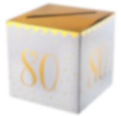 Diese weiß-goldene Geschenkbox ist perfekt für Ihren 80. Geburtstag. Egal, ob Sie Geld, Glückwünsche oder Grüße sammeln möchten. Die Geschenkbox hat einen diagonalen Schnitt im goldenen Verschluss und die Zahl 80 auf jeder Seite. Es ist würfelförmig und 20 x 20 cm groß.
