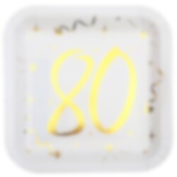 10 weiße Pappteller mit dekorativen Mustern und der Zahl 80 in Goldfolie. Diese quadratischen Teller sind eine schöne Ergänzung für die Partydekoration zum 80. Geburtstag. Die Teller sind 23 x 23 cm groß.