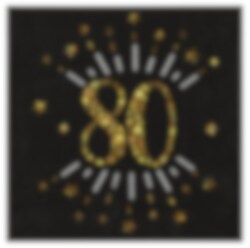 10 schwarze Servietten mit dekorativen Mustern und der Zahl 80 in Goldglitter. Diese Servietten eignen sich perfekt als Dekoration für eine 80. Geburtstagsfeier. Die Servietten haben 3 Lagen und fühlen sich luxuriös an. Größe 16,5 x 16,5 cm.