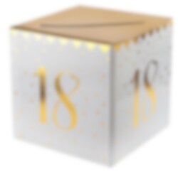 Diese weiß-goldene Geschenkbox ist perfekt für Ihren 18. Geburtstag. Egal, ob Sie Geld, Glückwünsche oder Grüße sammeln möchten. Die Geschenkbox hat einen diagonalen Schnitt im goldenen Verschluss und die Zahl 18 auf jeder Seite. Es ist würfelförmig und 20 x 20 cm groß.