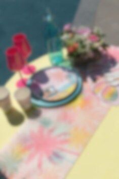 Pastellfarbene und schöne Tischläufer, deren Design Gedanken an einen wärmeren Ort mit herrlichen Palmen weckt. Die Tischläufer sind perfekt, wenn Sie ein schönes Sommerfest veranstalten möchten.