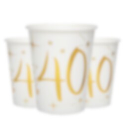 10 weiße Pappbecher mit dekorativen Sternen und der Zahl 40 in Goldfolie. Diese Becher sind wirklich schön und eine perfekte Ergänzung für die Party zum 40. Geburtstag. Die Becher sind 10 cm hoch und fassen 270 ml.