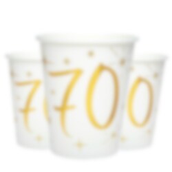10 weiße Pappbecher mit dekorativen Sternen und der Zahl 70 in Goldfolie. Diese Becher sind wirklich schön und eine perfekte Ergänzung für die Party zum 70. Geburtstag. Die Becher sind 10 cm hoch und fassen 270 ml.