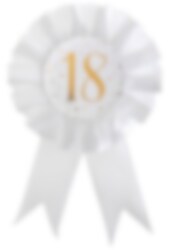 Schöne Rosette in Weiß und Gold mit der Zahl 18. Die Rosetten können sowohl als dekoratives Zubehör in beispielsweise Blumenarrangements verwendet werden, als auch von Ihnen an Ihrem 18. Geburtstag getragen werden. Die Rosette hat einen Durchmesser von 8 cm und ist 15 cm hoch.