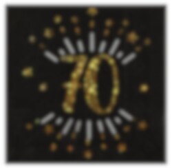 10 schwarze Servietten mit dekorativen Mustern und der Zahl 70 in Goldglitter. Diese Servietten eignen sich perfekt als Dekoration für eine 70. Geburtstagsfeier. Die Servietten haben 3 Lagen und fühlen sich luxuriös an. Größe 16,5 x 16,5 cm.
