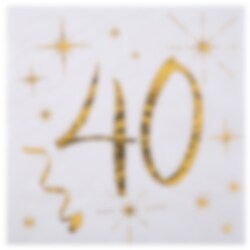 20 weiße Servietten mit dekorativen Mustern und der Zahl 40 in Goldfolie. Diese Servietten eignen sich perfekt als Dekoration für eine 40. Geburtstagsfeier. Die Servietten haben 3 Lagen und fühlen sich luxuriös an. Größe 12,5 x 12,5 cm.